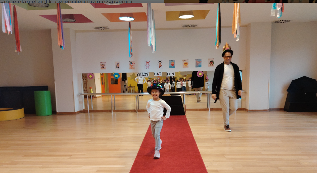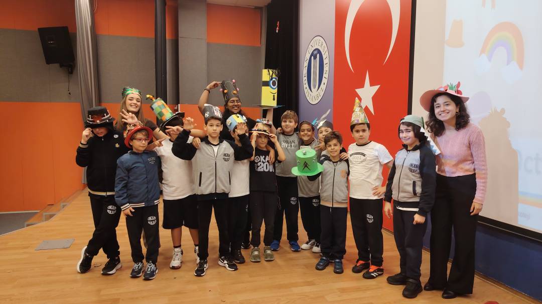 şapkaları büyük bir heyecanla arkadaşlarına tanıtan öğrencilerimiz, İngilizce